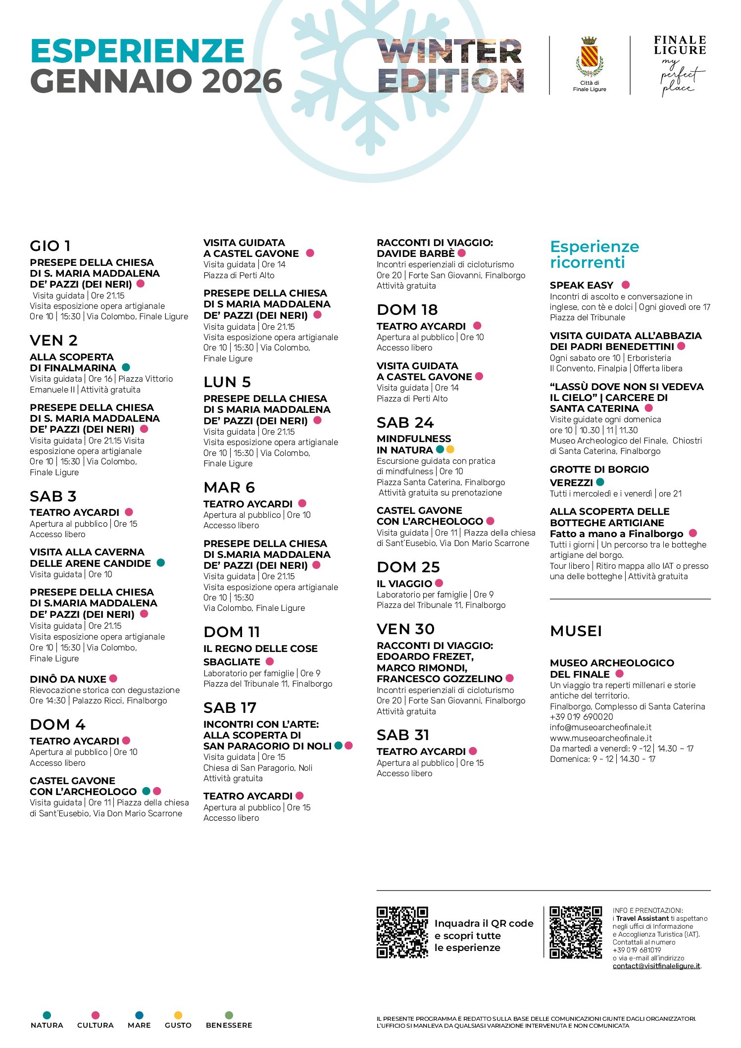 Durante l’inverno la città propone un calendario di esperienze che cambia mese dopo mese: visite guidate, attività all’aria aperta, trekking panoramici, laboratori creativi per grandi e piccoli, musei e luoghi della cultura sempre pronti ad accoglierti. Occasioni pensate per chi ama scoprire con calma, lasciarsi sorprendere e vivere il territorio in modo autentico.